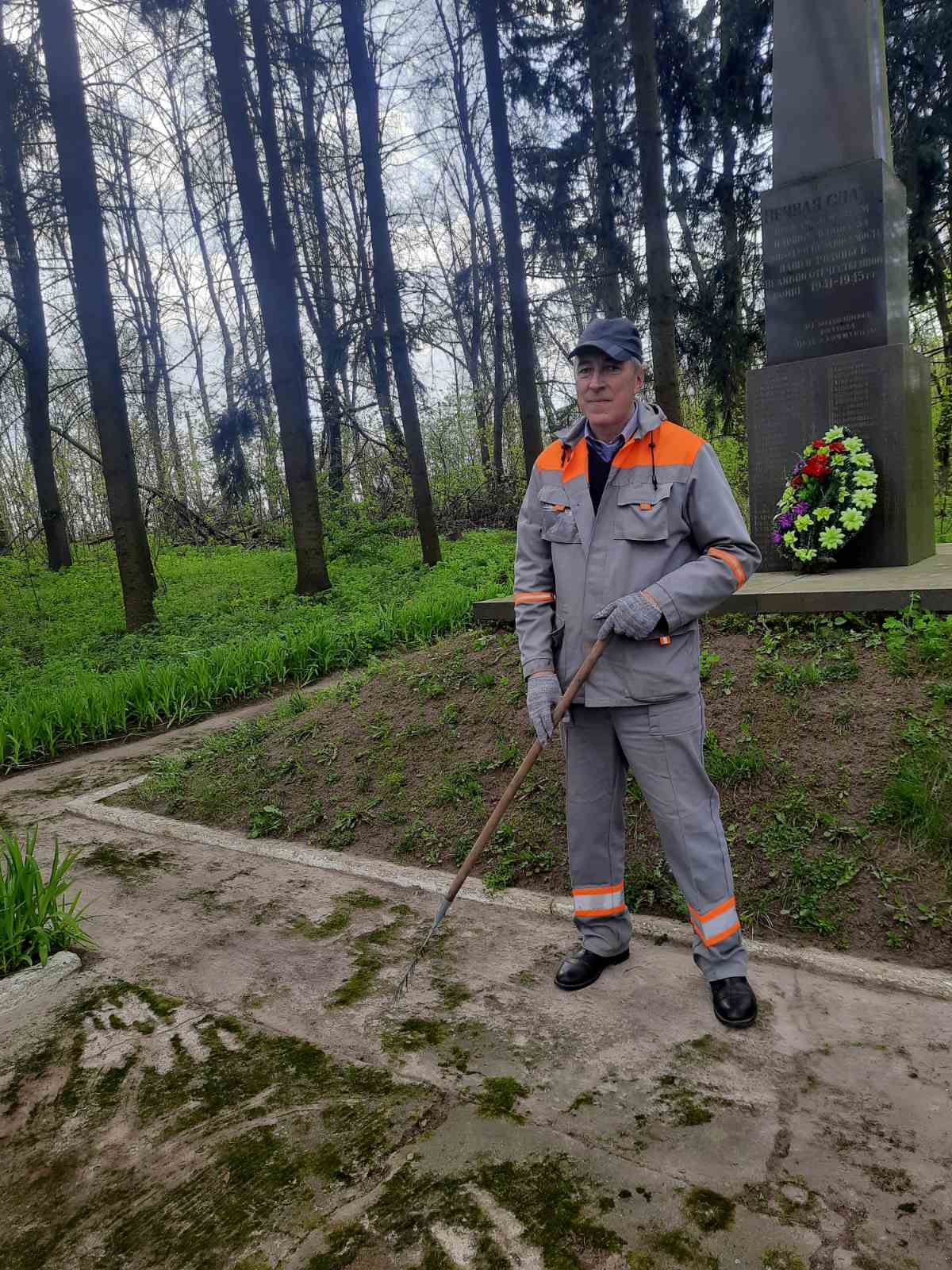 Директор предприятия Михаил Осипенко совместно с группой сотрудников предприятия работали на уборке территории у обелиска в д. Соболи Брагинского района.