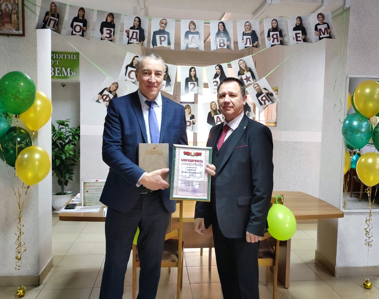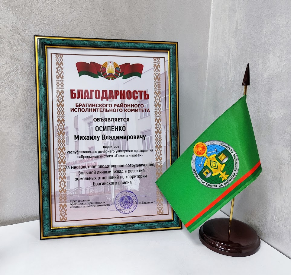 23 февраля начальник Отдела землеустройства Брагинского районного исполнительного комитета Черненок Валерий Васильевич вручил директору Государственного предприятия «Проектный институт «Гомельгипрозем» Осипенко Михаилу Владимировичу благодарность Брагинского районного исполнительного комитета за многолетнее плодотворное сотрудничество, большой личный вклад в развитие земельных отношений на территории Брагинского района.