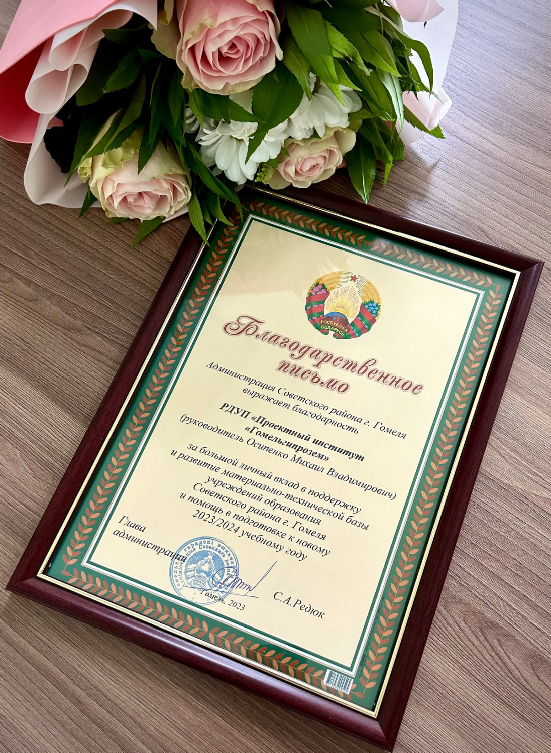 22 августа 2023 года глава администрации Советского района г. Гомеля Сергей Анатольевич Редюк в торжественной обстановке вручил директору Государственного предприятия «Проектный институт «Гомельгипрозем» Михаилу Владимировичу Осипенко благодарственное письмо, адресованное коллективу предприятия.