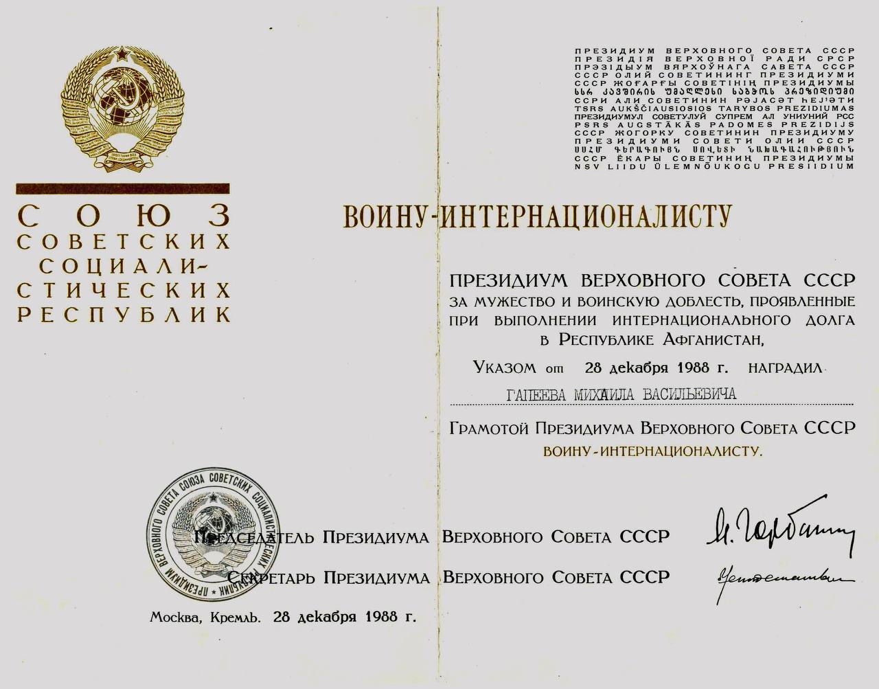Награжден Грамотой Президиума Верховного совета СССР за мужество и воинскую доблесть, проявленные при выполнении интернационалистического долга в Республике Афганистан и медалью воину-интернационалисту, а также медалью «Воину-интернационалисту от благодарного афганского народа»