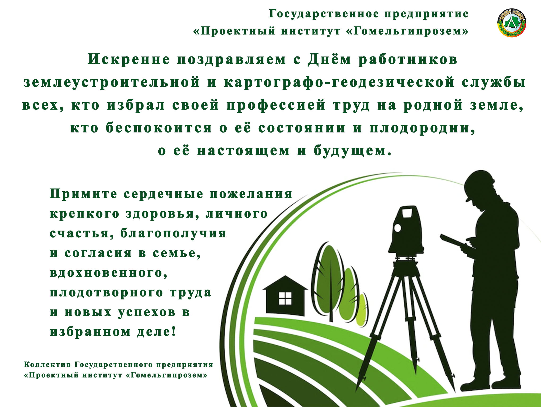Государственное предприятие «Проектный институт «Гомельгипрозем» поздравляет работников и ветеранов землеустроительной и картографо-геодезической службы с профессиональным праздником!