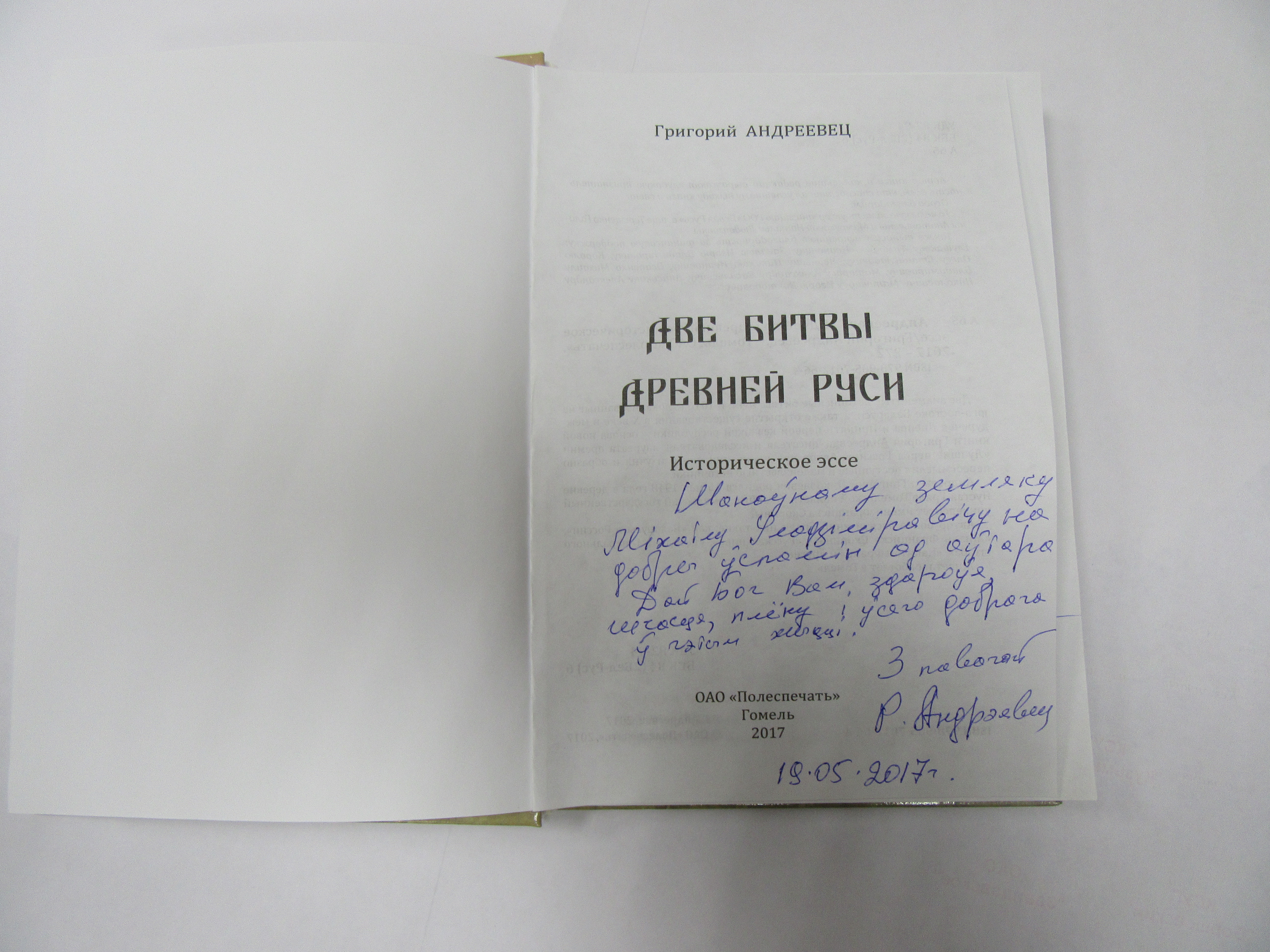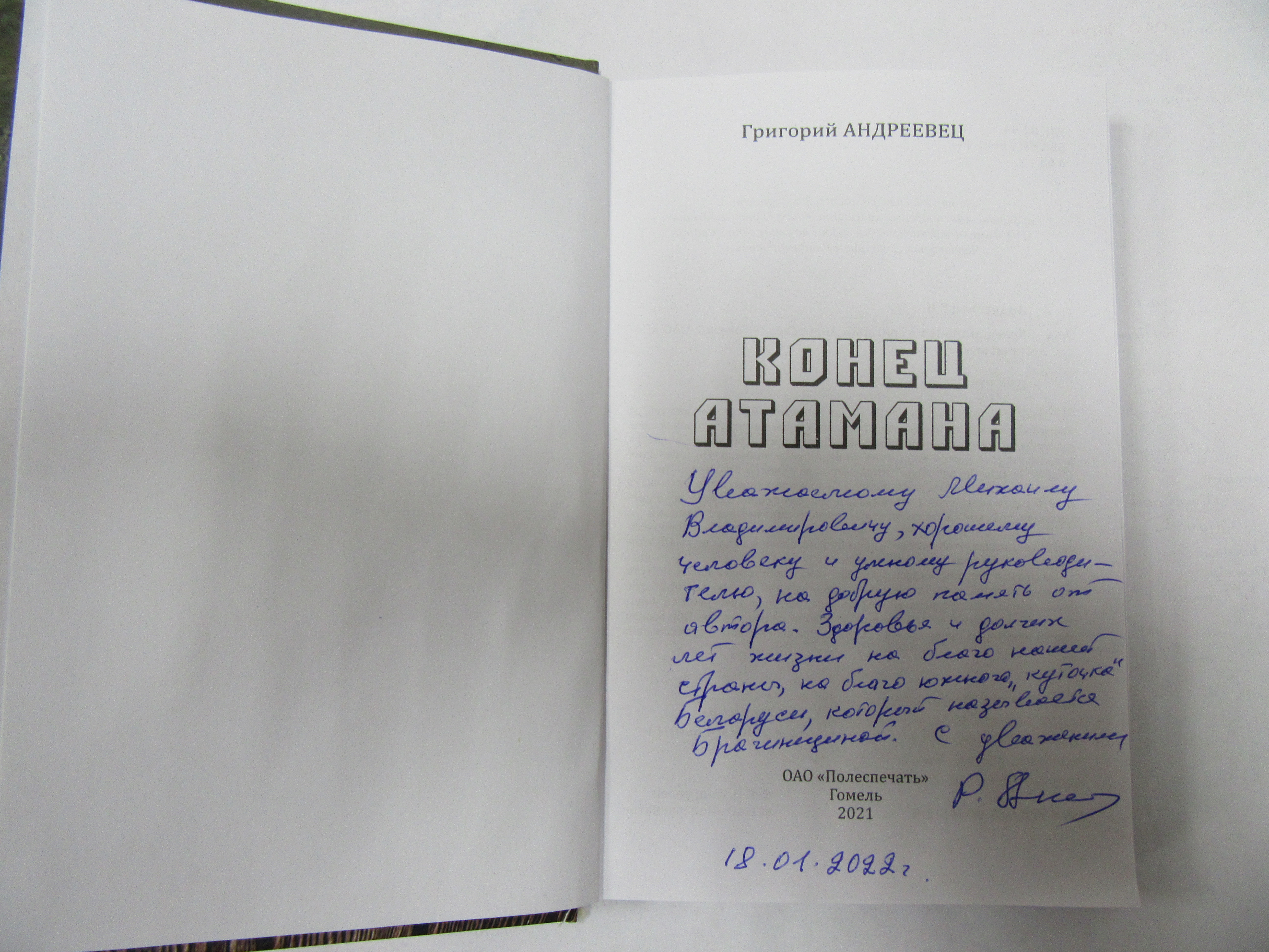 К поездке присоединился гомельский писатель, уроженец Лоевского района, Андреевец Григорий Николаевич. Совместное сотрудничество с ним продолжается с 2016 года, когда наше предприятие оказывало поддержку в выпуске книги «Две битвы Древней Руси». Сейчас Григорий Николаевич написал новую книгу «Конец атамана», где повествует о послереволюционном периоде нашего края. В конце 2021 года в газете «Літаратура і мастацтва» №52 была опубликована статья-аннотация на вышеуказанное произведение. https://zviazda.by/sites/default/files/52-2021.pdf