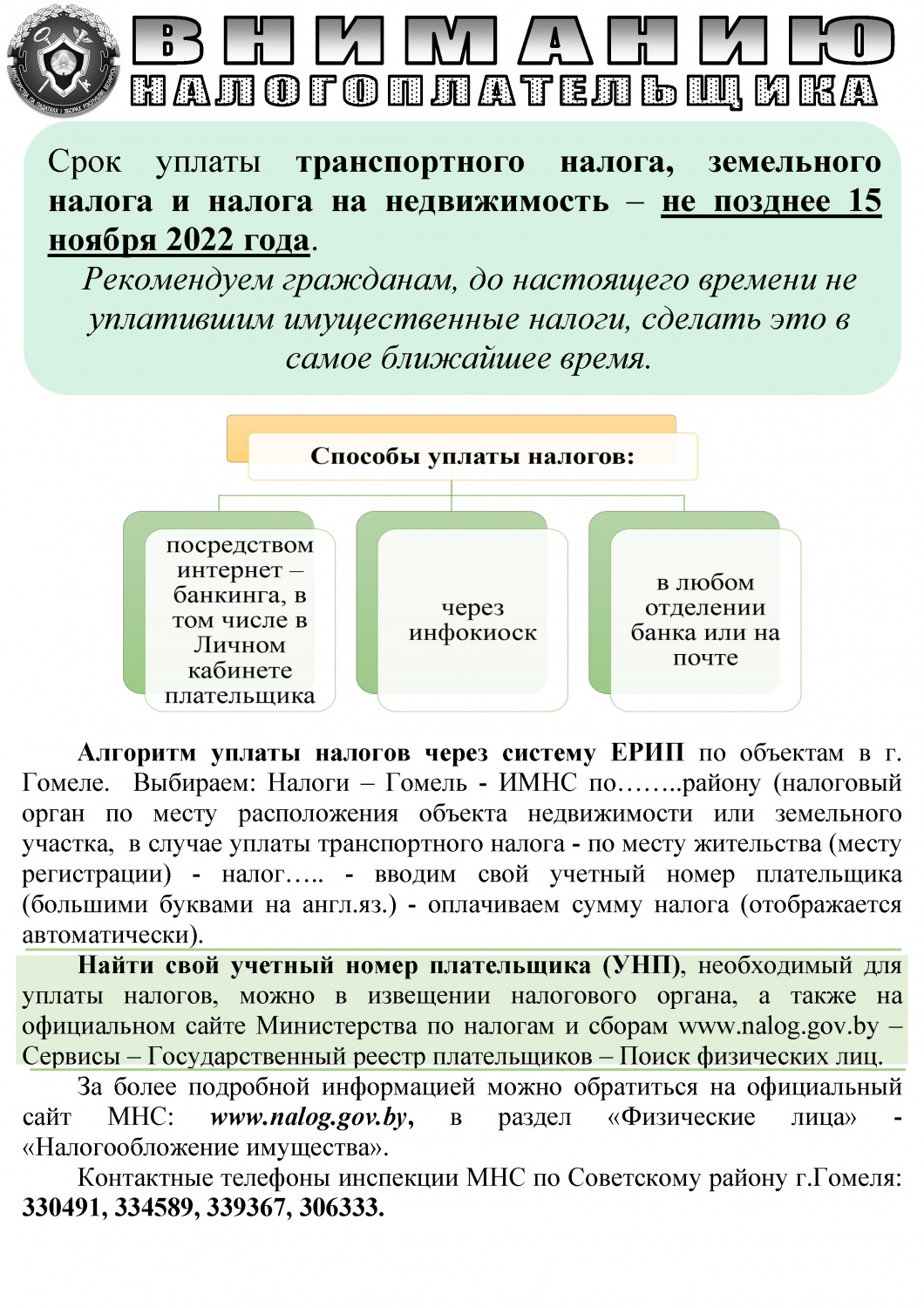 Инспекция Министерства по налогам и сборам Республики Беларусь по Советскому району г.Гомеля напоминает гражданам, владеющим недвижимостью, земельными участками, а также транспортными средствами о необходимости уплаты транспортного налога, а также авансовых платежей по налогу на недвижимость и земельному налогу не позднее 15 ноября 2022 года.