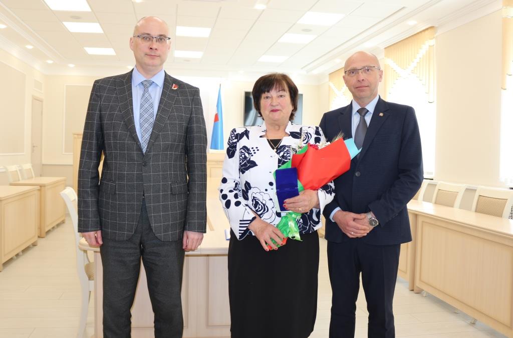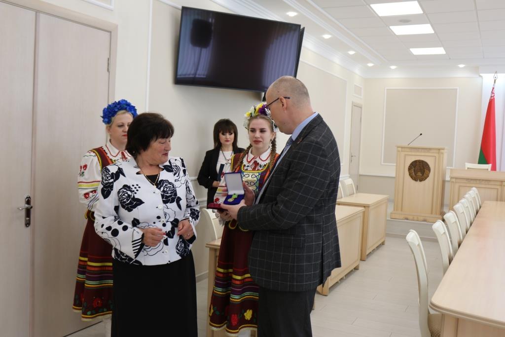 Дмитрий Матусевич вручил нагрудный знак отличия Государственного комитета по имуществу Республики Беларусь за многолетний добросовестный труд в системе Госкомимущества и значительный вклад в ее развитие Ярош Валентине Владимировне, за плечами которой более 35 лет работы на нашем предприятии.