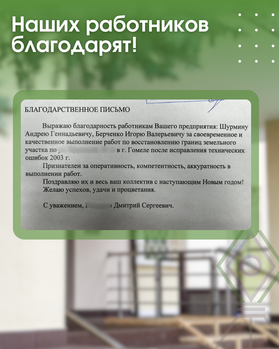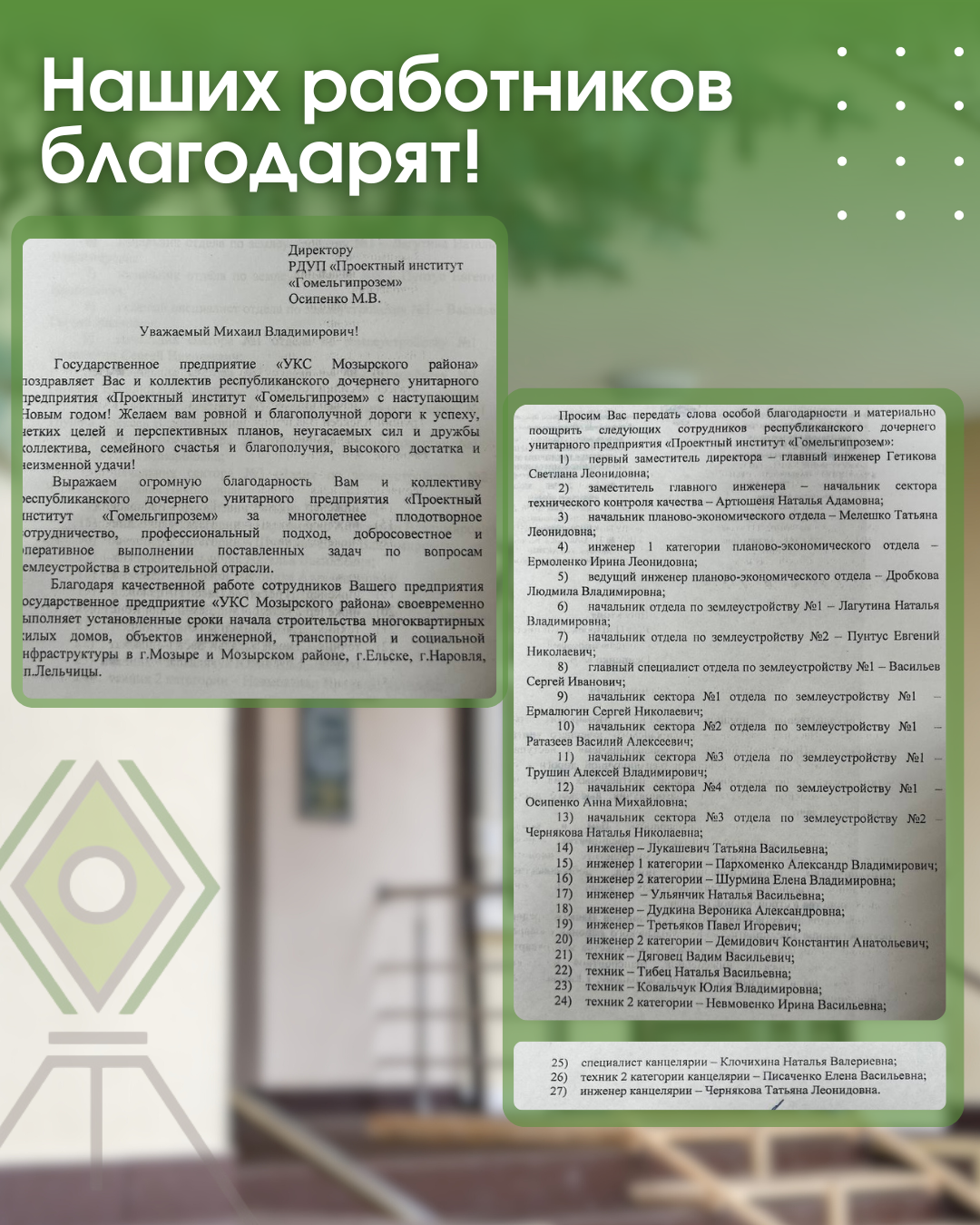 В адрес Государственного предприятия «Проектный институт «Гомельгипозем» поступила благодарность от Государственного предприятия «УКС Мозырского района» за многолетнее плодотворное сотрудничество, профессиональный подход, добросовестное и оперативное выполнение поставленных задач по вопросам землеустройства в строительной отрасли.