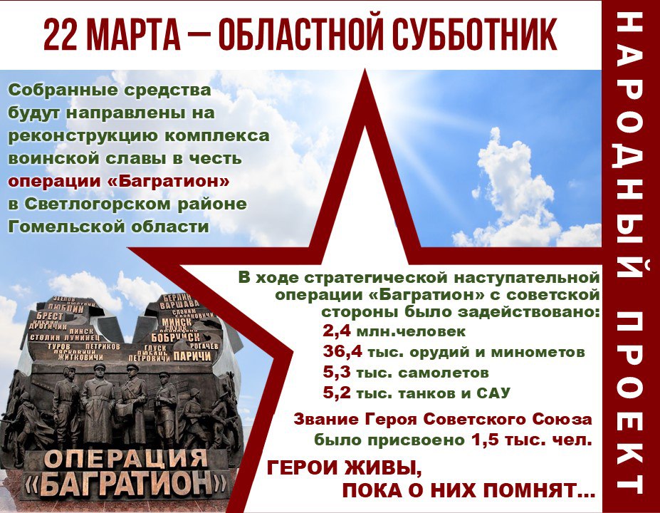 Собранные во время субботника в Гомельской средства планируется направить на реконструкцию комплекса воинской славы в честь операции «Багратион».