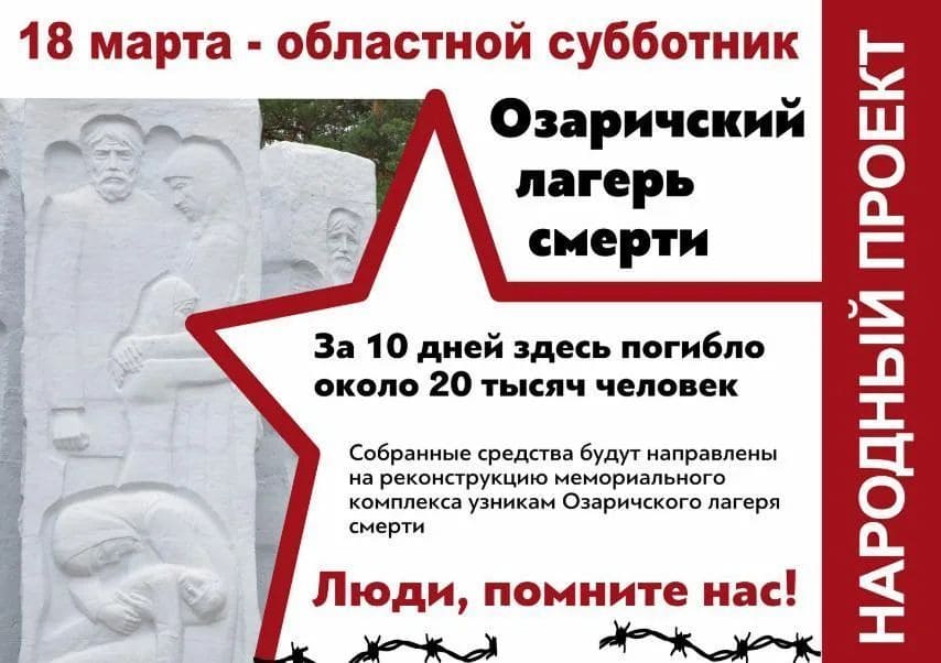 Денежные средства, заработанные во время проведения областного субботника, планируется направить на финансирование работ по реконструкции мемориального комплекса узникам Озаричского лагеря смерти в Калинковичском районе.