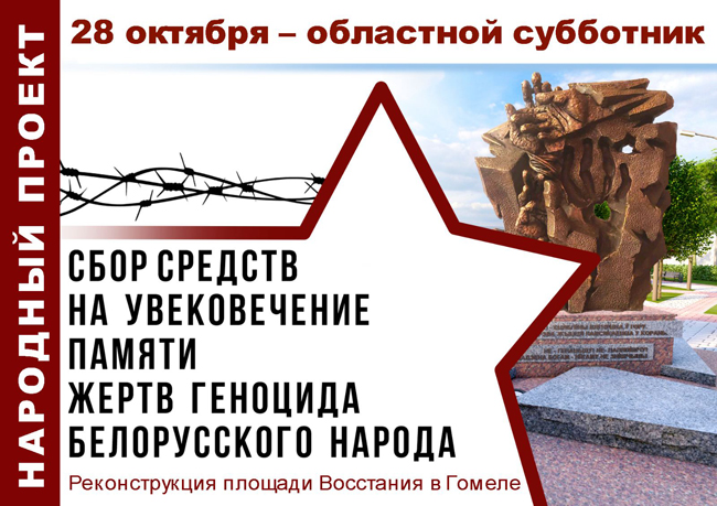 Собранные в рамках субботника средства будут направлены на финансирование работ (услуг), связанных с созданием, изготовлением и установкой памятного знака, посвященного жертвам геноцида белорусского народа, на площади Восстания в г.Гомеле, по благоустройству площади Восстания в г.Гомеле, а также ремонт, реконструкцию, реставрацию, восстановление историко-культурных ценностей, мемориальных комплексов, мест боевой и военной славы времен Великой Отечественной войны, воинских захоронений, захоронений жертв войн, воинских памятников.