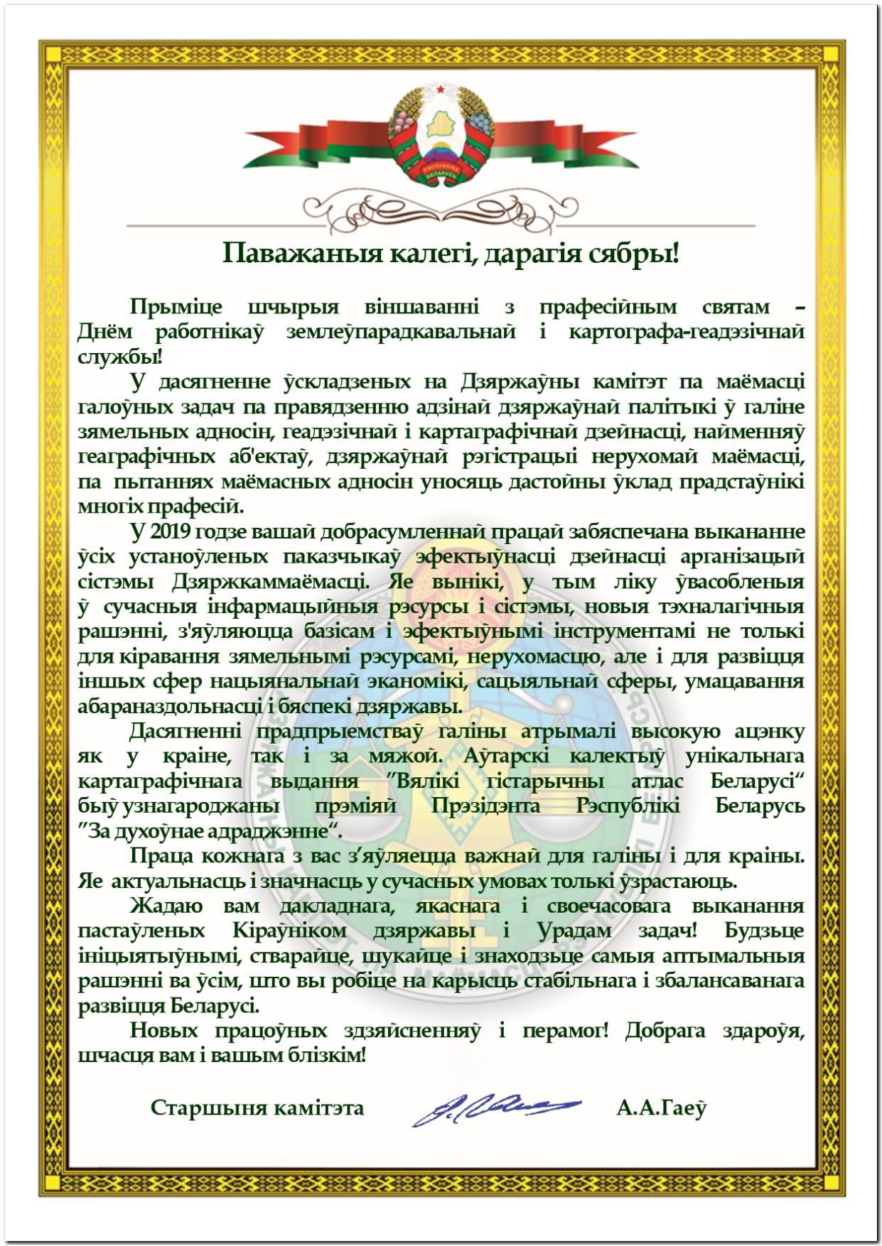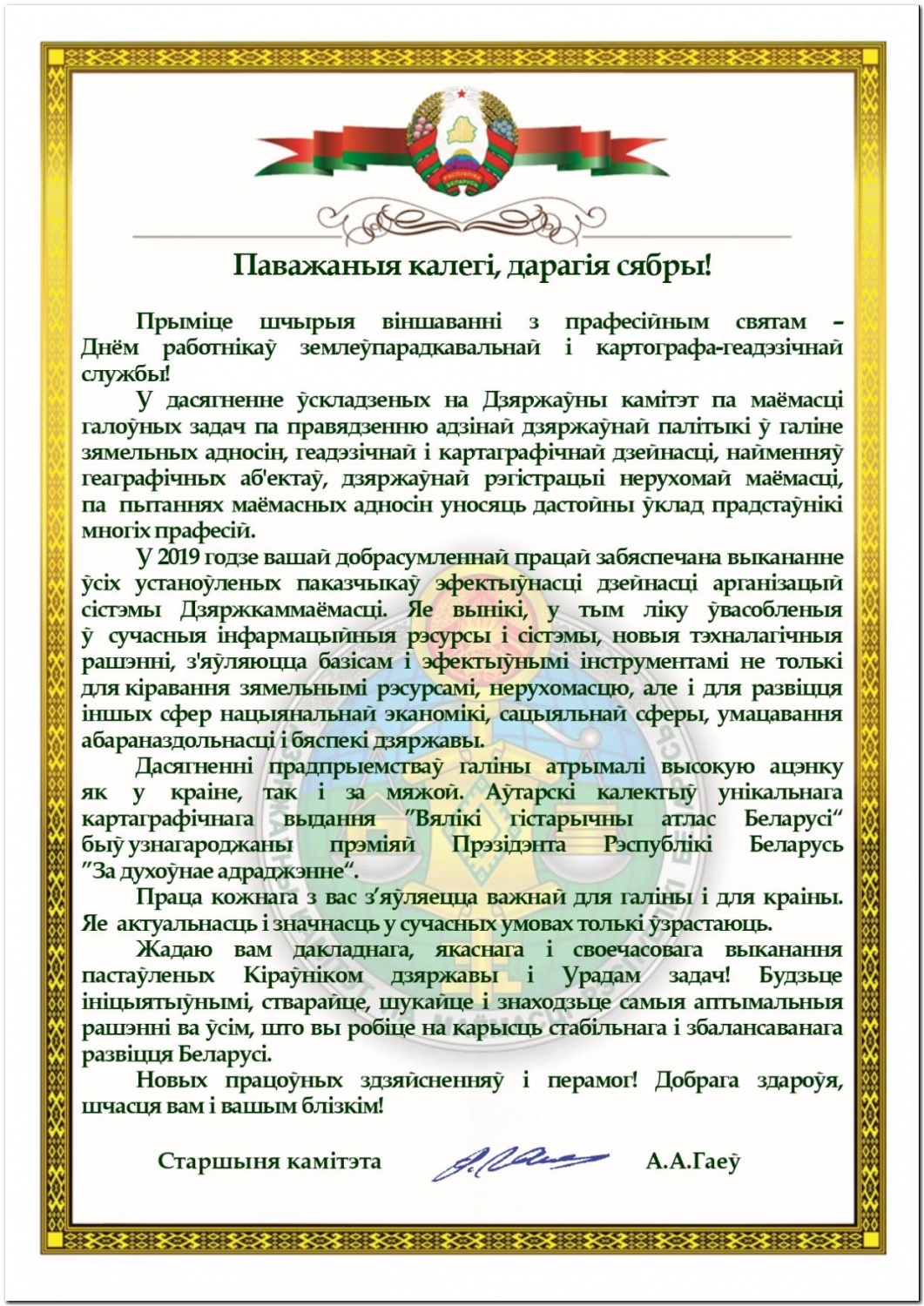 Поздравление Председателя Государственного комитета по имуществу Республики Беларусь Андрея Анатольевича Гаева с профессиональным праздником — Днем работников землеустроительной и картографо-геодезической службы