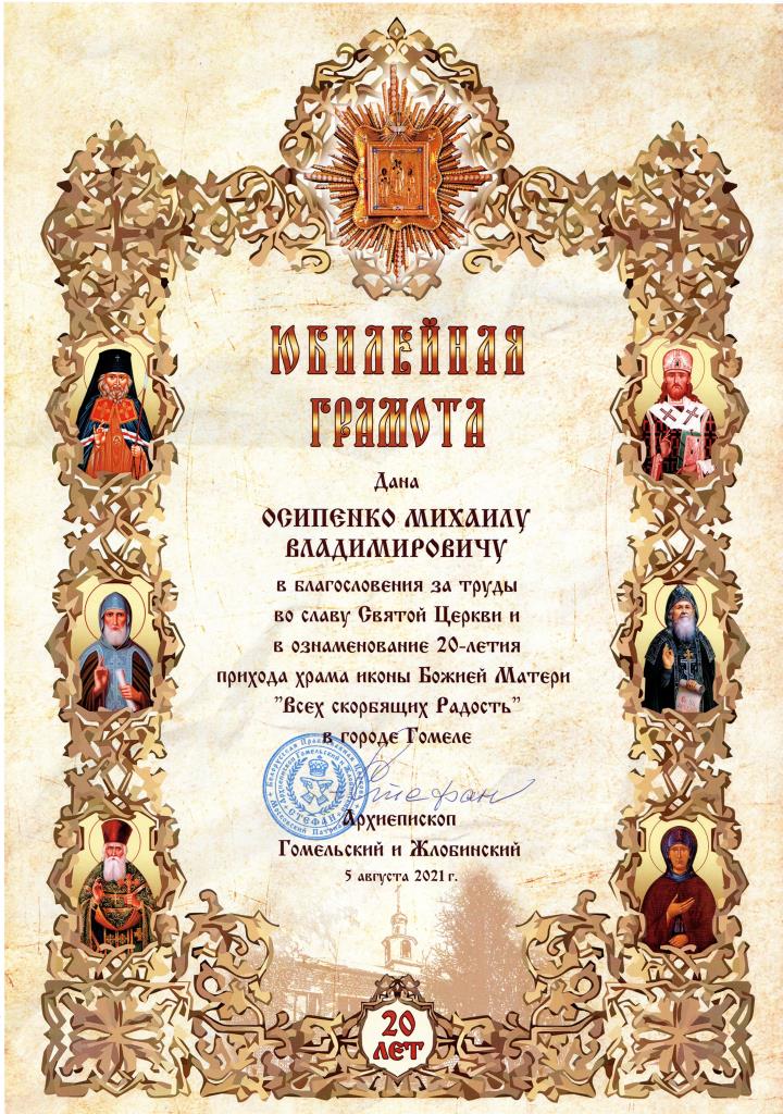 05.08.2021 года состоялось торжественное мероприятие в ознаменование 20-тилетия прихода Храма иконы Божией Матери «Всех скорбящих Радость» с участием архиепископа Гомельского и Жлобинского Стефана. В мероприятии принял участие директор РДУП «Проектный институт «Гомельгипрозем» Осипенко Михаил Владимирович, в благословения за труды во славу Святой Церкви был отмечен юбилейной грамотой.
