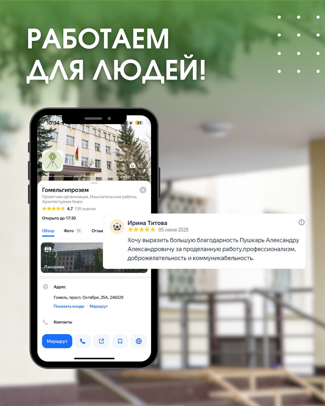 В адрес государственного предприятия «Проектный институт «Гомельгипрозем» поступил отзыв с благодарностью, адресованный инженеру сектора №2 отдела землеустройства №1 Александру Александровичу.