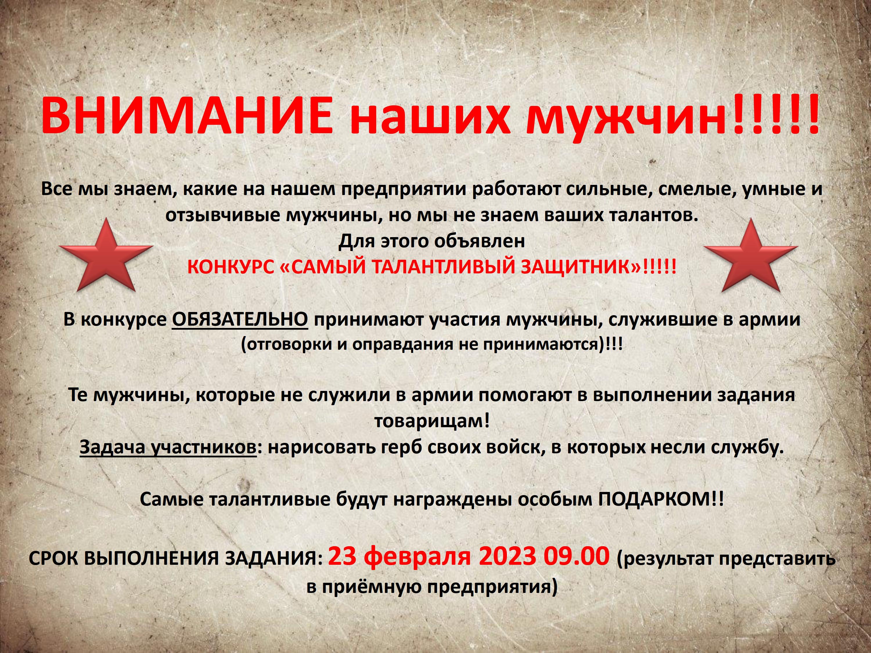 В честь праздника Дня защитника отечества на предприятии было организованно поздравление мужчин и проведён конкурс «Самый талантливый защитник», в котором участники за короткое время должны были нарисовать герб или знак отличия воинской части, в которой они проходили срочную службу. Участие в конкурсе приняли порядка 30 работников предприятия.