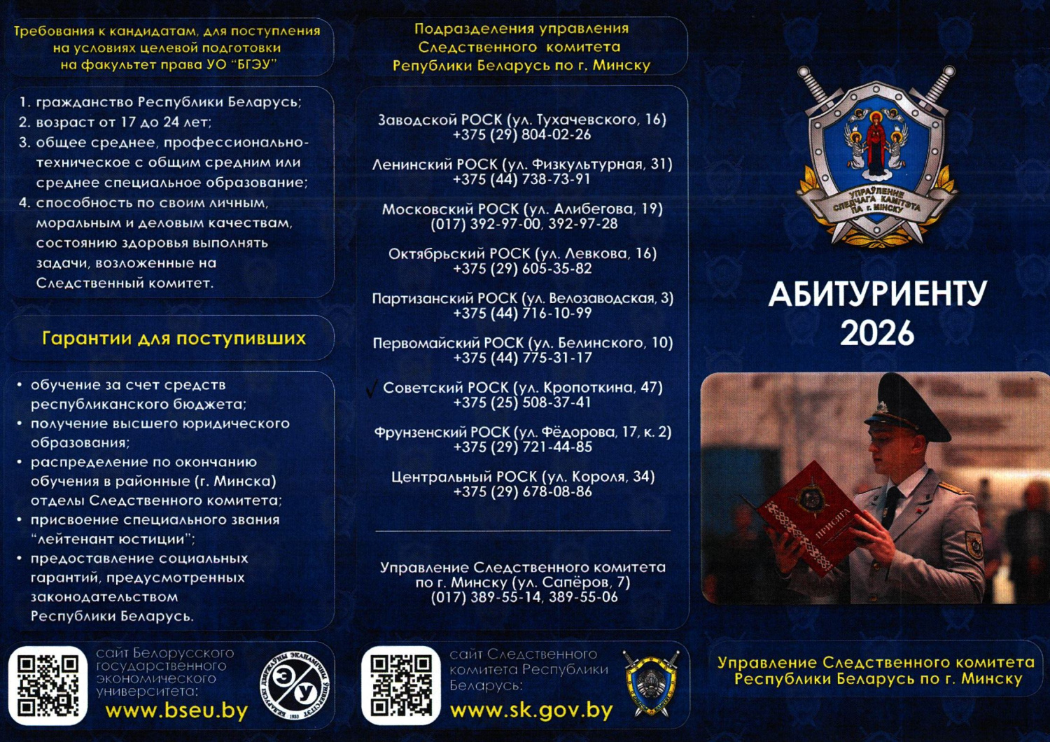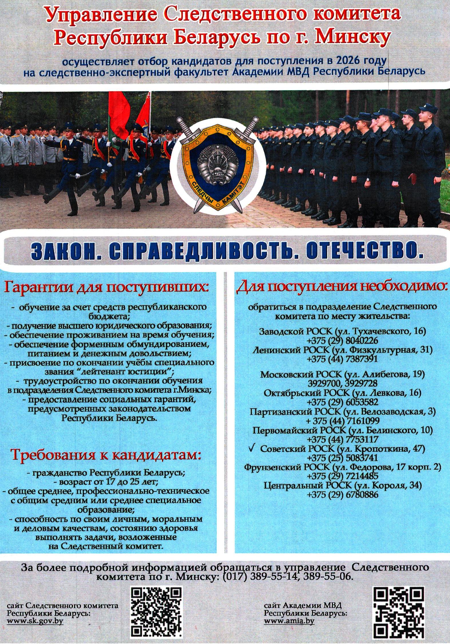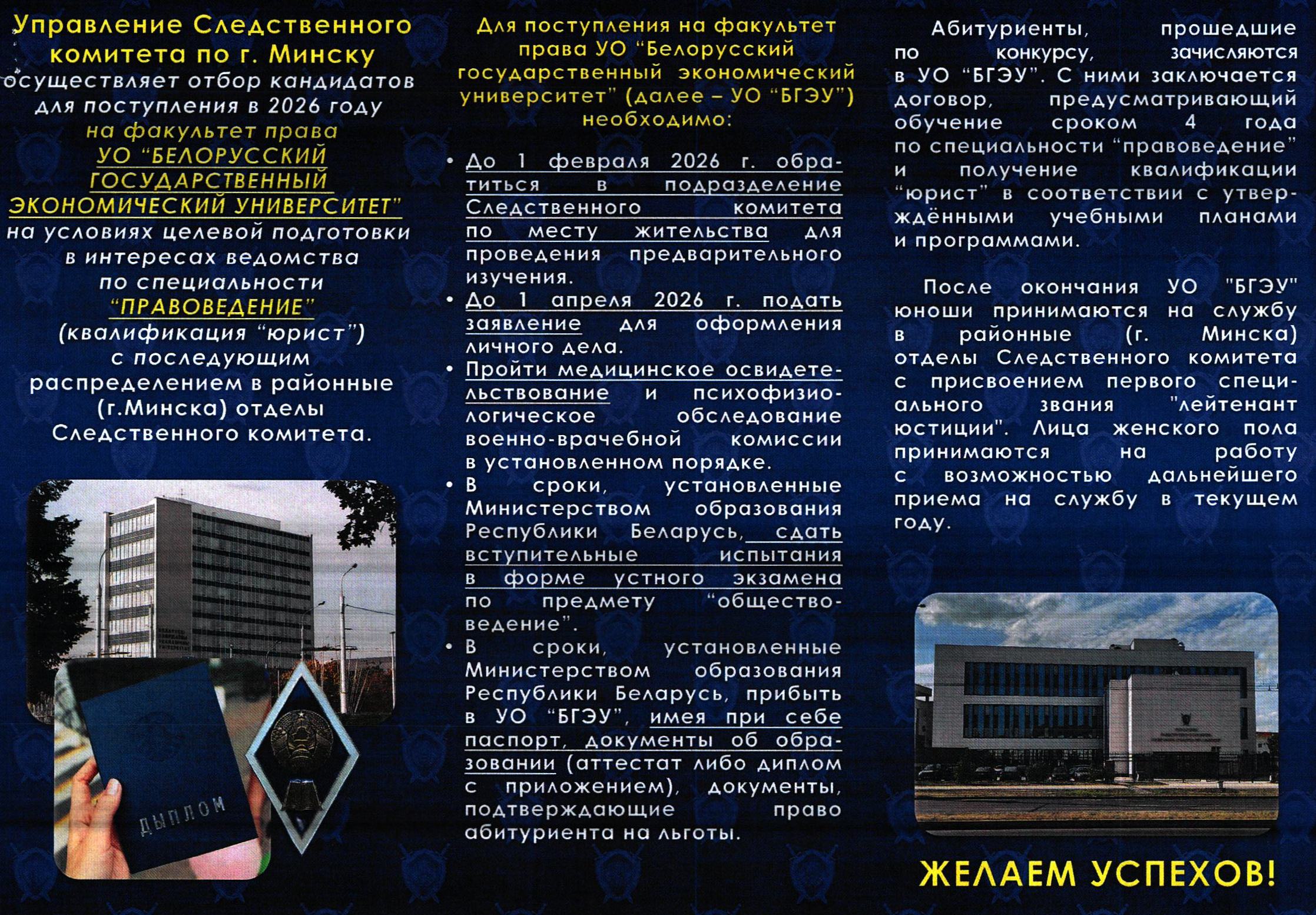 Следственный комитет Республики Беларусь информирует о подборе кандидатов для поступления на следсвенно-экспертный факультет УО «Академия МВД Республики Беларусь» , а также на факультет права УО « Белорусский государственный экономический университет» на условиях целевой подготовки